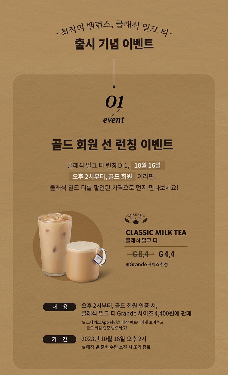 클래식 밀크 티 런칭 D-1, 10월 16일 오후 2시부터, 골드 회원 이라면, 클래식 밀크 티를 할인된 가격으로 먼저 만나보세요.