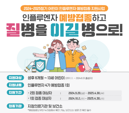 2024∼2025절기 인플루엔자 국가예방접종 독감예방접종 무료대상은 생후 6개월에서 13세까지 어린이, 임신부, 65세 이상(1959년 12월 31일 이전 출생자) 입니다.